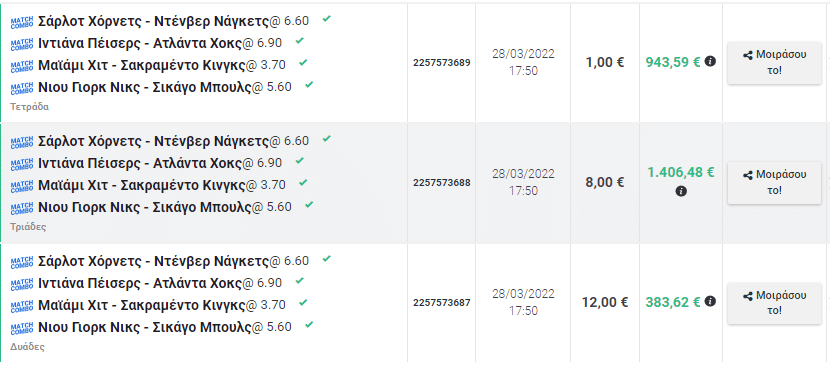 Ο υπερτυχερός έπαιξε ένα δελτίο με 4 επιλογές, στοιχηματίζοντας το ποσό των 21 ευρώ! Συγκεκριμένα κέρδισε στα παιχνίδια του NBA,με Match Combo επιλογές Σάρλοτ Χόρνετς, Ιντιάνα Πέισερς,Μαιάμι Χιτ,Νιου Γιορκ Νικς σε συνολική τρομερή απόδοση [943] κερδίζοντας το ποσό των 2733€.