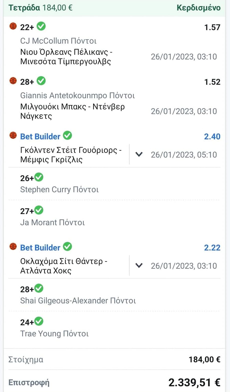 Πέλικανς με Τίμπεργουλβς και τους 22 τουλάχιστον πόντους του ΜακΚόλουμ στο 1.57. Μπακς με Νάγκετς και φυσικά Γιάννης στους 28+ για το 1.52. Γουόριορς με Γκρίζλις και πόντους από Κάρι (26+) και Μοράντ (27+) με το combo να πληρώνει 2.40. Τέλος, Θάντερ με Χοκς και τους Γκίλτζιους-Αλεξάντερ (28+) και Γιάνγκ (24+) στο 2.22.
