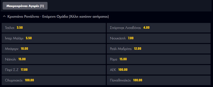 Δεν λείπει ωστόσο και το ελληνικό στοιχείο! Κι αυτό γιατί βλέπουμε πως ΑΕΚ, Ολυμπιακός και Παναθηναϊκός, πλασάρονται ως υποψήφιες για την επόμενη ομάδα του Ρονάλντο. Και μάλιστα, χρυσοπληρώνουν! Στο 100.00 προσφέρεται η κάθε μια!