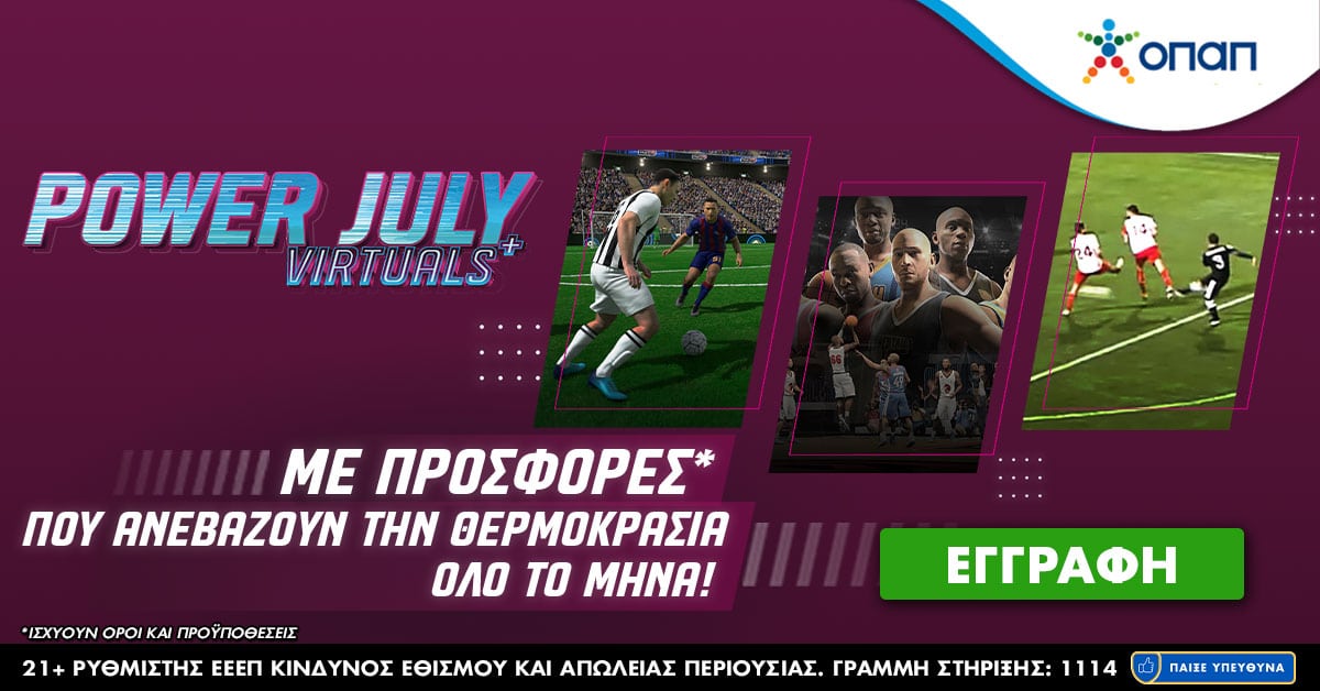 Ο Ιούλιος θα είναι… καυτός στο Pamestoixima.gr! Power July στα Virtuals+ με προσφορές* που ανεβάζουν τη θερμοκρασία όλο τον μήνα! Μπορεί, λοιπόν, η δράση σε ποδόσφαιρο και μπάσκετ να μειώνεται, ωστόσο στο Pamestoixima.gr υπάρχει ράλι προσφορών*, ενώ είναι διαθέσιμη η μεγαλύτερη ποικιλία virtual sports και στιγμιότυπα από πραγματικούς αγώνες του παρελθόντος!