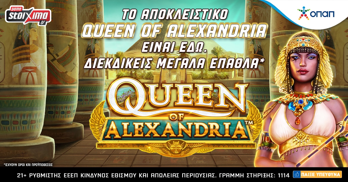 Δεν είναι αυτή όμως η μοναδική νέα προσφορά, αφού με αφορμή το ντεμπούτο του νέου παιχνιδιού της Microgaming, Queen Of Alexandria, το casino του Pamestoixima.gr έχει ετοιμάσει για εσάς μια μοναδική κλήρωση με τρομερά βραβεία για τους 100 τυχερούς που θα κληρωθούν. Για να λάβετε μέρος, αρκεί να παίξετε στο καινούριο πολυαγαπημένο παιχνίδι Queen Of Alexandria και συγκεντρώνετε εισιτήρια για την κλήρωση! Απλό, αλλά και εξαιρετικό.