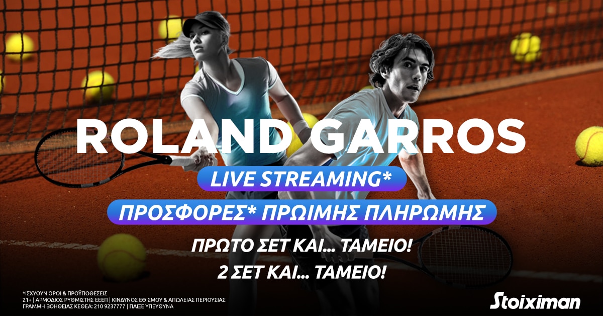 Φυσικά το Roland Garros, όπως όλα τα Grand Slams, είναι στη Stoiximan με Live Streaming*, πλούσιο live betting, αμέτρητα ειδικά στοιχήματα, Super Ενισχυμένες Αποδόσεις αλλά και μακροχρόνιες αγορές.