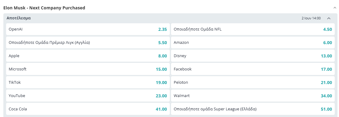 Κι όμως, υπάρχει ακόμα και αυτό το ενδεχόμενο σύμφωνα με τη Novibet! Συγκεκριμένα, η στοιχηματική εταιρία προσφέρει στο 51.00 το ενδεχόμενο η επόμενη αγορά του Έλον Μασκ να είναι ομάδα του ελληνικού πρωταθλήματος!