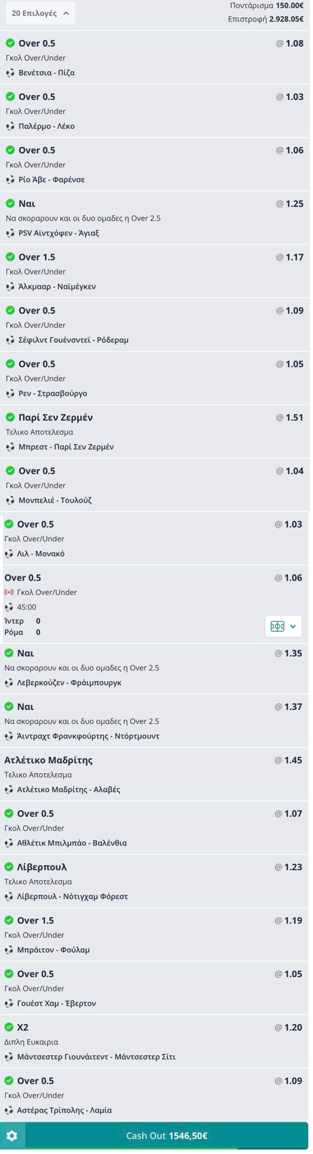 Ο σημερινός μας μάγκας, αυτό έκανε. Έριξε μια 20άδα στα 150 ευρώ, με αποδόσεις από… 1.03 μέχρι 1.51, πήρε τα σχεδόν τρία χιλιάρικα και μην τον είδατε!