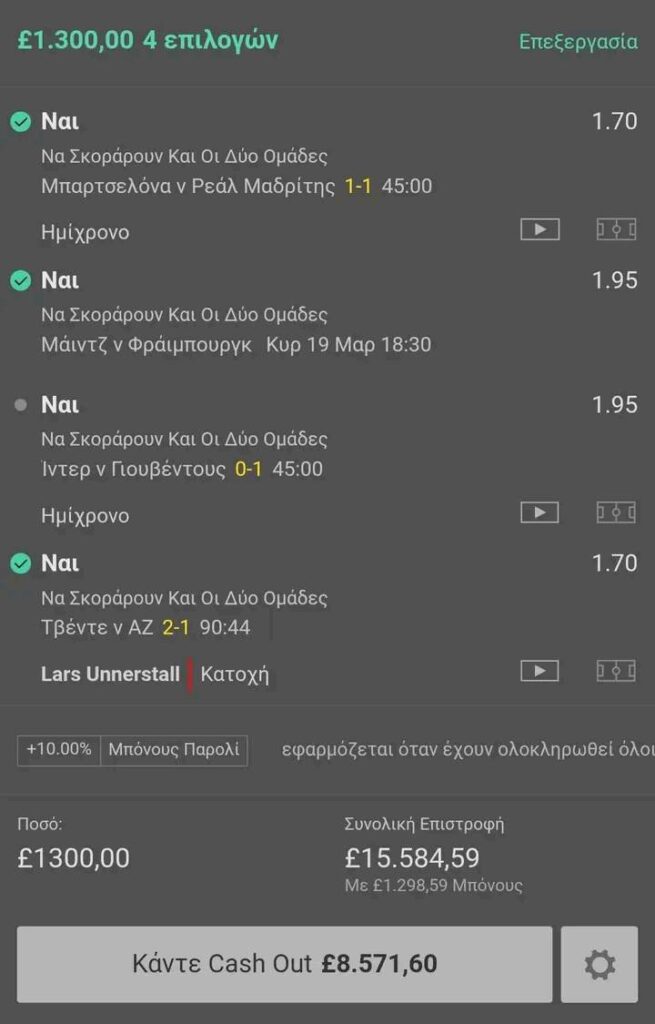 Και κάπου εδώ έρχεται ο τυπάς, πατάει το cash out και παίρνει σχεδόν 8.600 λίρες από τις 15.600 πιθανές και λέει ευχαριστώ. Φυσικά, δικαιώθηκε. Η Ίντερ δεν ισοφάρισε ποτέ. Έβγαλε κέρδος 7.300 λιρών, με δελτίο που δεν θα περνούσε ποτέ αν το άφηνε.
