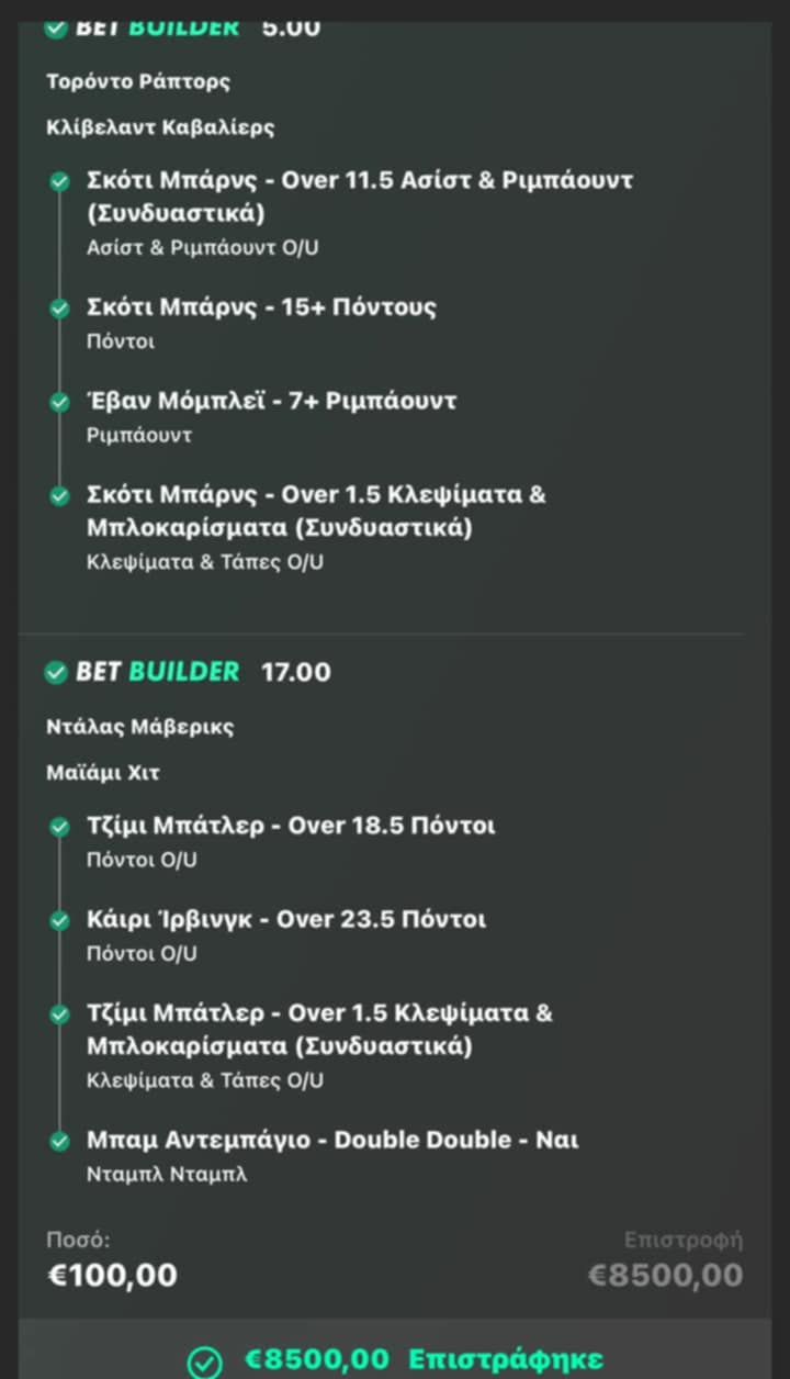 Στο 5.00 το πρώτο, στο 17.00 το δεύτερο, στο 85.00 ο πολλαπλασιασμός τους και στα 8.500 ευρώ τα κέρδη του! Όχι κι άσχημα, έτσι;
