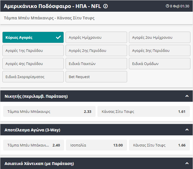 Τα ξημερώματα της Δευτέρας (08/02, 01:30), η καρδιά των Ηνωμένων Πολιτειών χτυπάει στην Τάμπα της Φλόριντα και στο «Raymond James Stadium», όπου Chiefs και Buccaneers θα διεκδικήσουν τον τίτλο του 55ου Super Bowl, με τις στοιχηματικές να έχουν ετοιμάσει αμέτρητα στοιχήματα για τον τελικό… των τελικών!