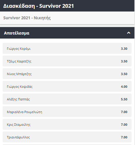 Μετά την αποχώρηση της Κάτιας Ταραμπάνκο, που αποτελούσε μία πολύ δυνατή παίκτρια για τους Survivors και την επαναδημιουργία των ομάδων στο φετινό reality επιβίωσης, οι πρώτες αποδόσεις για το νικητή έχουν βγει στον «αέρα». Σύμφωνα με τις στοιχηματικές εταιρίες, ο Γιώργος Κορόμι είναι το πρώτο φαβορί για να είναι αυτός που θα κατακτήσει τις 100.000 ευρώ, σε απόδοση 3.50. Σε απόσταση αναπνοής βρίσκονται τόσο ο Νίκος Μπάρτζης (είχε βγει πολυτιμότερος παίκτης για τους «Μαχητές»), όσο και ο Τζεϊμς Καφετζής, με απόδοση 3.50.