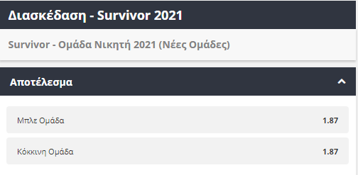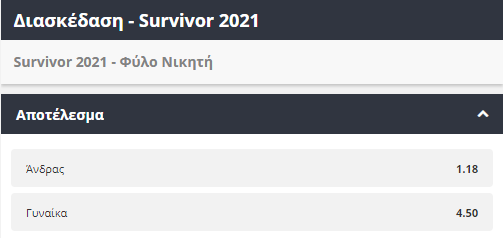 Μοιρασμένες δείχνουν και οι αποδόσεις για την ομάδα που θα «βγάλει» τον τελικό νικητή, με την «Μπλε» και «Κόκκινη» ομάδα να βρίσκεται σε απόδοση 1.87. Όσον αφορά το φύλο του νικητή, οι «άνδρες» παίζουν… μπάλα μόνοι τους, με το 1.18 να είναι ενδεικτικό για τον τελικό νικητή.