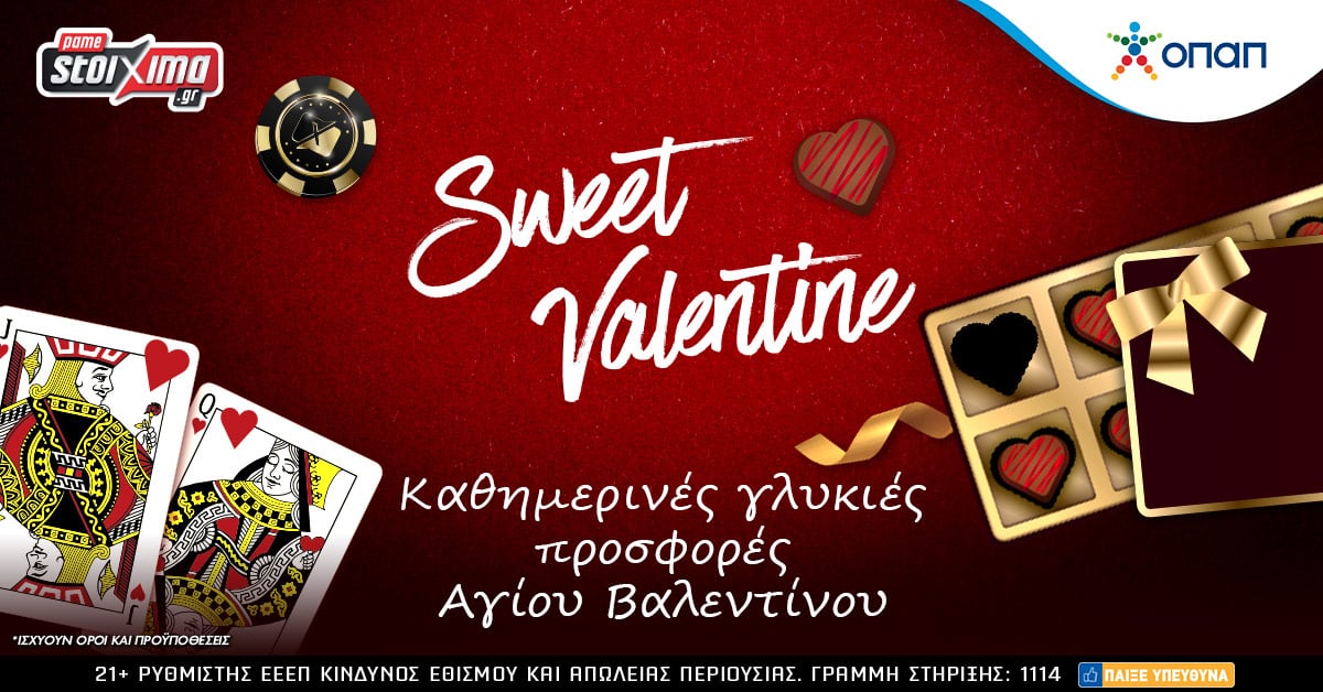 Κάθε ημέρα και μια φανταστική προσφορά* Βαλεντίνου στο Sweet Valentine στο Live Casino του Pamestoixima.gr! Περισσότερα για τις καθημερινές προσφορές* δεν μπορούμε να αναφέρουμε, ωστόσο όλες οι πληροφορίες για τις… ρομαντικές καθημερινές προσφορές* μπορείς να βρεις στο Pamestoixima.gr!