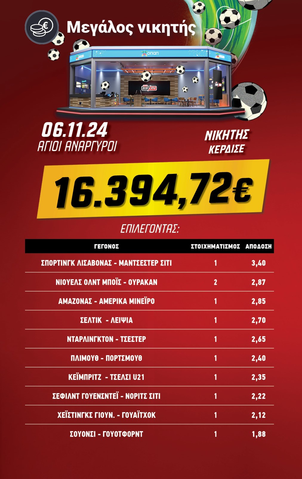 Τεράστια νίκη στο στοίχημα: Κέρδισε €86.244,88 με 7 επιλογές στο Pamestoixima.gr!