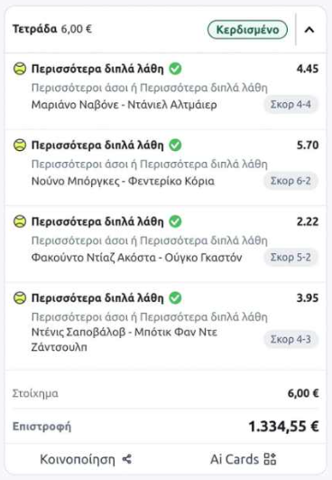 Και όχι σε αστείες αποδόσεις! Από 2.22 μέχρι και 5.70 οι επιλογές του, με τη συνολική απόδοση του δελτίου να αγγίζει το 222.00! Και πράγματι, τον δικαίωσαν αφού οι τενίστες «προτίμησαν» τα λάθη από τους άσους!