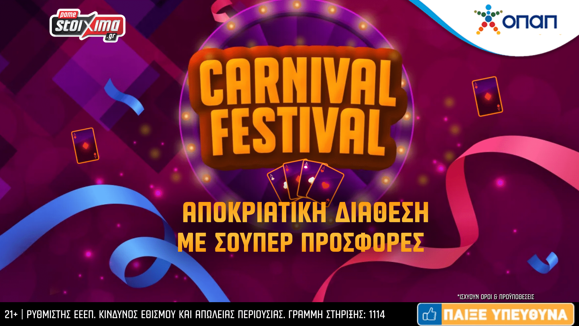 «21+ |Αρμόδιος Ρυθμιστής ΕΕΕΠ | Κίνδυνος εθισμού & απώλειας περιουσίας | ΓΡΑΜΜΗ ΣΤΗΡΙΞΗΣ: 1114| Παίξε Υπεύθυνα |».