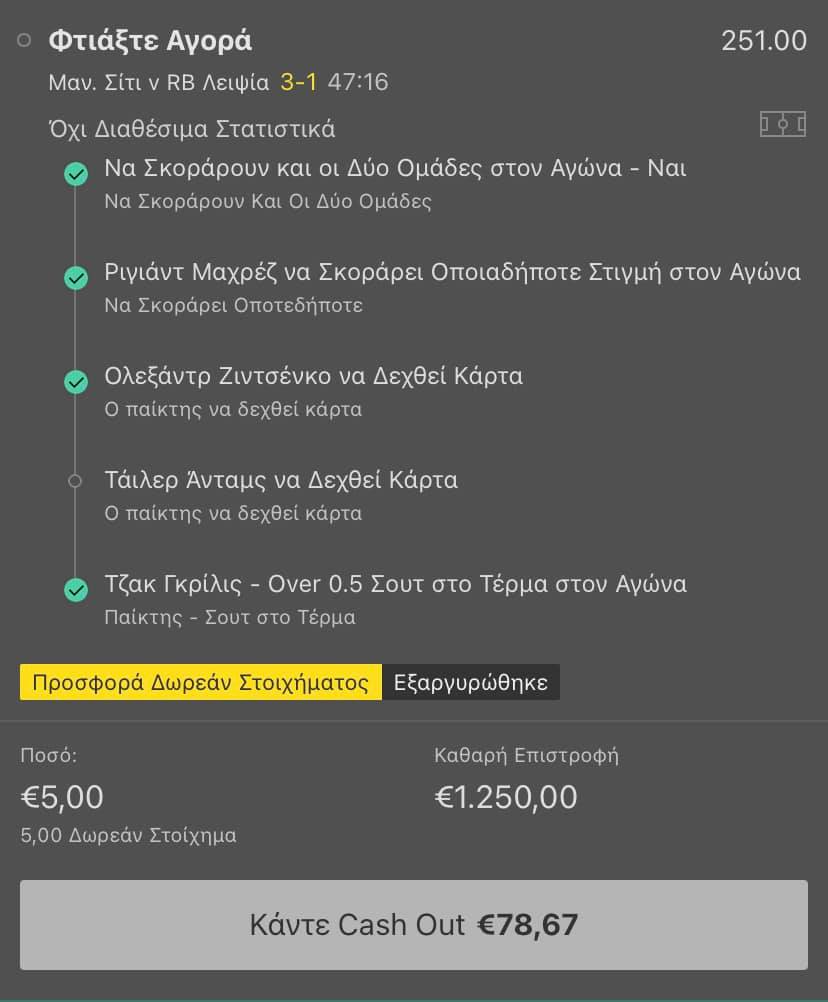 Ο παίκτης κατάφερε να έχει καθαρό κέρδος 1.250 ευρώ, αφού το ποντάρισμα των 5 ευρώ ήρθε μετά από free bet. Το στοίχημα φάνηκε από τα πρώτα λεπτά ότι θα πήγαινε καλά, με τον παίκτη όμως να παραμένει ψύχραιμος και να μένει “μέσα” στο στοίχημα μέχρι τέλους.