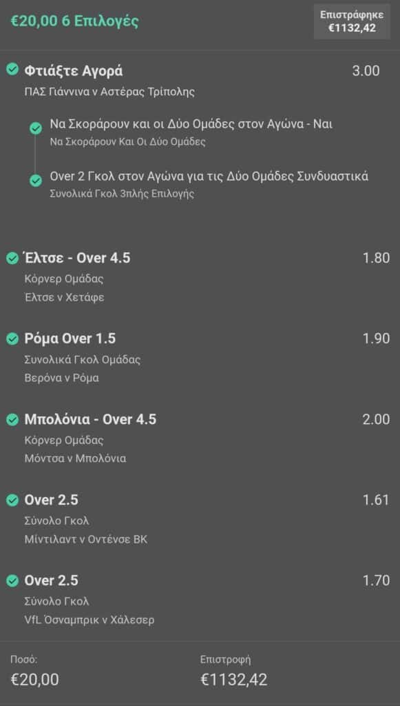 Τι έπαιξε; Απλά οβεράκια σε Μίντιλαντ – Οντένσε και Όσναμπρικ – Χάλεσερ. Έπαιξε το over 1,5 των γκολ της Ρόμα στη Βερόνα, έριξε και το combo του goal/goal & over 2,5 στο ματς του ΠΑΣ Γιάννινα με τον Αστέρα Τρίπολης.