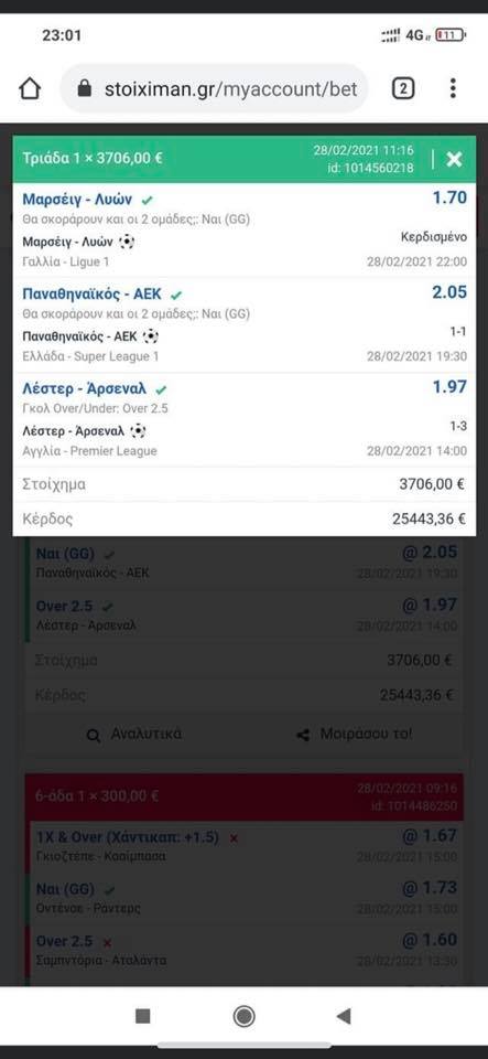 Ο παίκτης είχε επιλέξει να ποντάρει ένα διόλου ευκαταφρόνητο ποσό (3.700 ευρώ) σε τρεις αναμετρήσεις που πίστευε πολύ και τελικά δικαιώθηκε και μάλιστα με σχετική ευκολία, αφού και οι τρεις αγώνες που είχε επιλέξει «βγήκαν» πανηγυρικά.