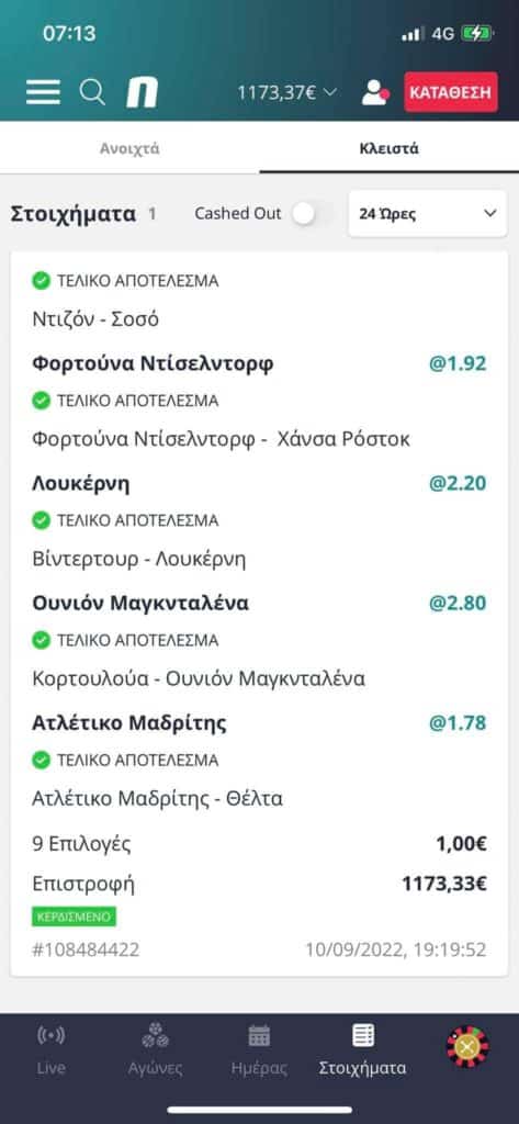 Μερικά σημεία επιβεβαιώθηκαν εύκολα, άλλα πάλι, δύσκολα. Όπως και να ‘χει, το δελτίο έβγαλε απόδοση 1.173,33, το οποίο ήταν και το ποσό που κέρδισε ο φίλος!