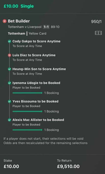 Είναι να τρελαίνεσαι ρε ‘σεις! Ο παικταράς έπιασε γκολ του Γκάκπο, γκολ του Σον, κάρτα του Ουντότζι, κάρτα του Μπισούμα και κάρτα του ΜακΆλιστερ. Τι έχασε; Ναι, καλά μαντέψατε το. ΜΟΝΟ το γκολ του Ντίαζ, που ακυρώθηκε επειδή το VAR είπε στο διαιτητή «σωστή απόφαση» κι αυτός κατάλαβε πως εννοούσε σωστή απόφαση το οφσάιντ!