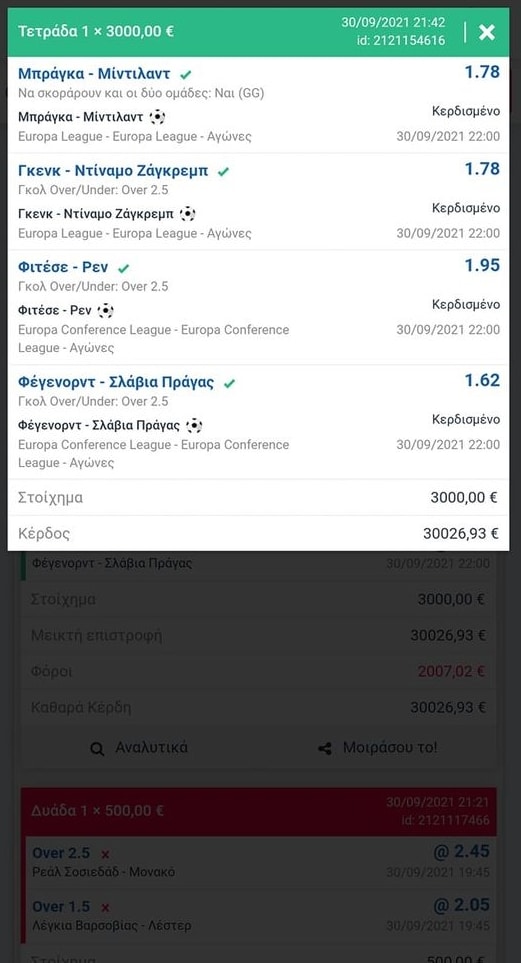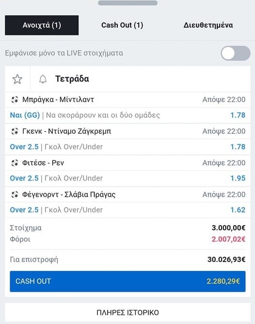 Το τέταρτο και τελευταίο ματς, με το οποίο ασχολήθηκε ο μεγάλος τυχερός ήταν αυτό ανάμεσα στην Φέγενορντ και την Σλάβια Πράγας!! Τα δύο γρήγορα γκολ των Ολλανδών μέχρι το 24′, του προσέφεραν την ευκαιρία ενός καλού cash out, αλλά ο ίδιος δικαιώθηκε με την επιλογή του να παραμείνει μέχρι τέλους στο στοίχημά του. Στο 63′ η Σλάβια μείωσε το σκορ σε 2-1 και έστειλε τον μεγάλο νικητή στο ταμείο, με συνολικό κέρδος 30.026,93!!!