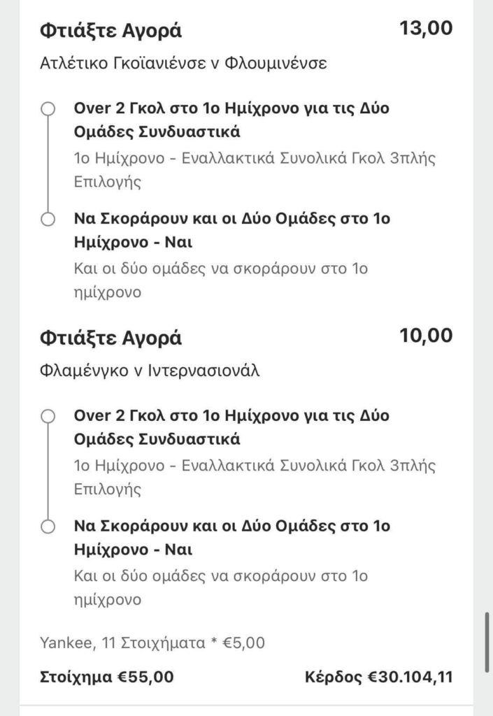 Όλα πιασμένα σε σύστημα Yankee (ήτοι, 2-3-4). Το ποντάρισμα; 5 ευρώ σε κάθε στήλη. Το σύνολο, 55. Τα κέρδη; Κρατιέστε; 30.100 ευρώ!