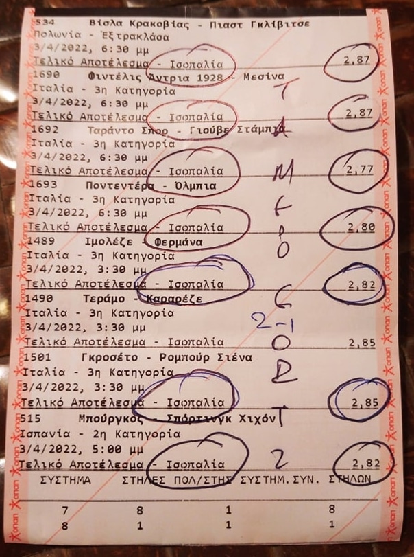 Αποφάσισε χθες Κυριακή, να ποντάρει σε οκτώ ισοπαλίες, σε σύστημα 7-8! Τι έπαιξε; Από Serie C μέχρι Πολωνία! Σε τι αποδόσεις; Όλες γύρω από το 2.80! Τι έπιασε; Επτά σημεία!