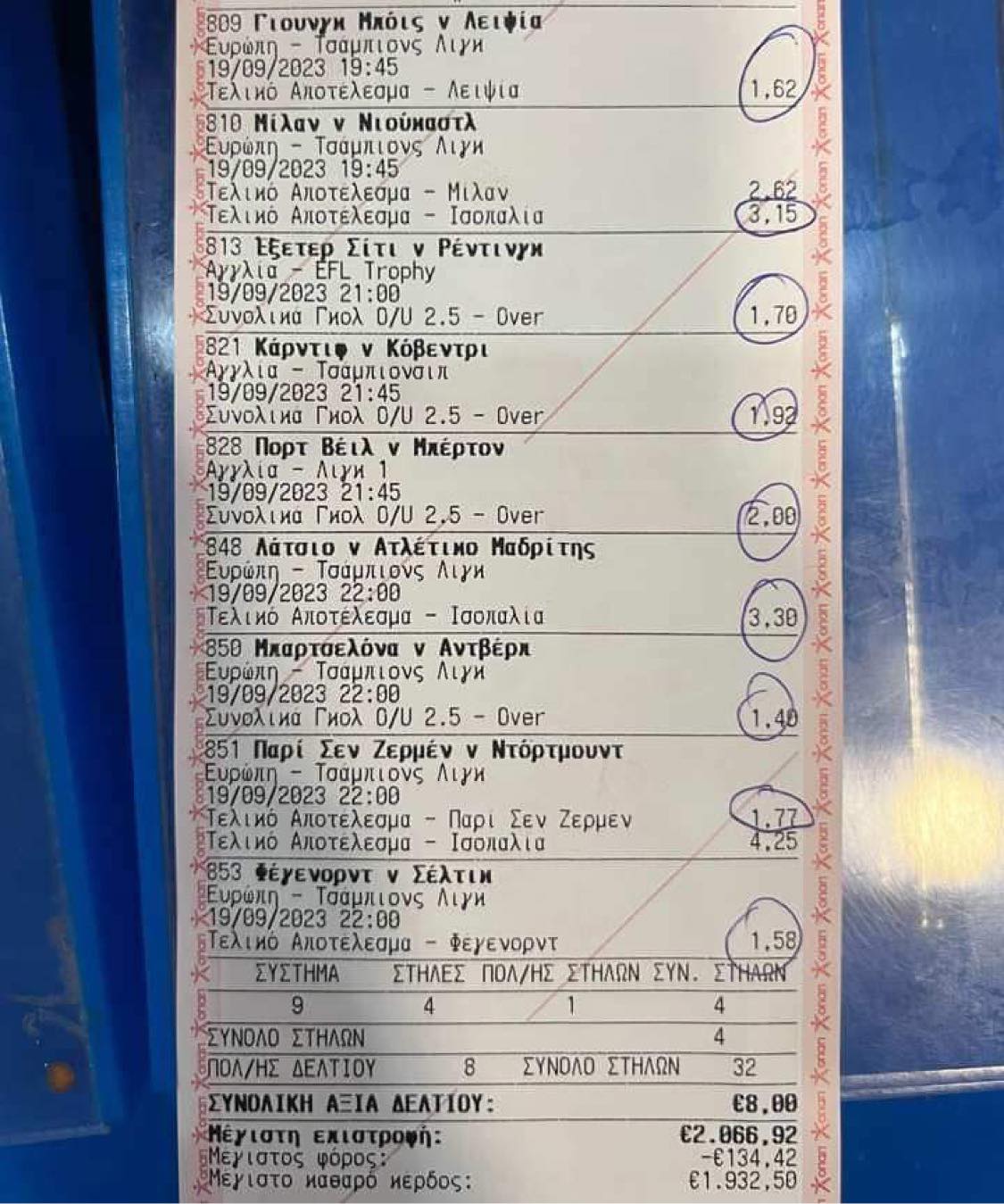 Στο σεντόνι, έπαιξε Λειψία, έπαιξε Χ τη Μίλαν με τη Νιούκαστλ, έπαιξε Χ τη Λάτσιο με την Ατλέτικο (και το έπιασε με γκολ του τερματοφύλακα στο τελευταίο δευτερόλεπτο), έπαιξε over 2,5 την Μπάρτσα, έπαιξε και Φέγενορντ.
