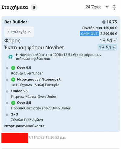 Απόδοση του Bet Builder στο 16.75, ποντάρισμα 150 ευρώ, όμως το δεύτερο γκολ των Γερμανών άγχωσε το μάγκα και τους χάρισε 222 ευρώ, cashάροντας στα σχεδόν 2.300!