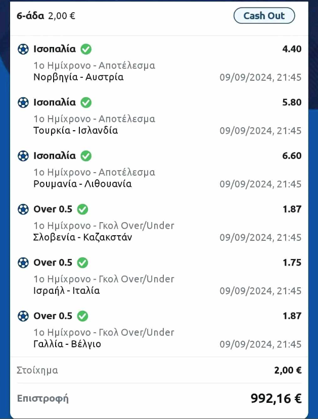 Λίγο πριν την ολοκλήρωση των 45’ αποφάσισε να πατήσει το κουμπάκι. Cashαρε στα 992 ευρώ αφού είχαν βγει τα Over, φοβούμενος πως κάποιο από τα Χ θα σπάσει. Και τους χάρισε 1.070.