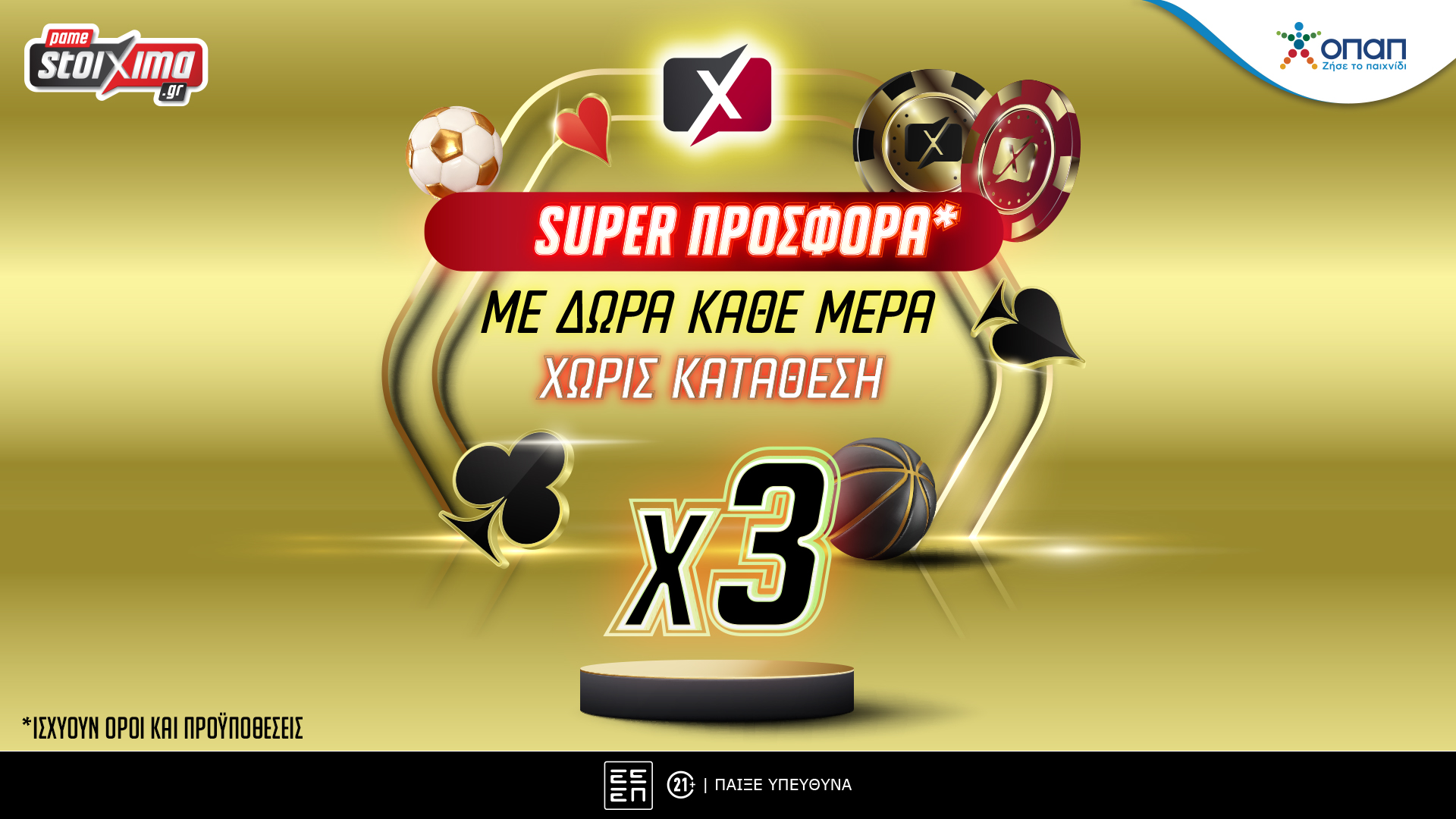 Τριπλή προσφορά με δώρα* κάθε μέρα για ένα μήνα χωρίς κατάθεση στο Pamestoixima.gr!