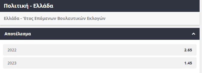 Εδώ, μπορείτε να δείτε αναλυτικά τις αποδόσεις για το Έτος των Επόμενων Βουλευτικών εκλογών στην Ελλάδα: