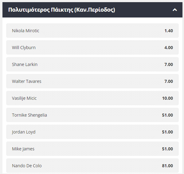 Όσον αφορά τον MVP της κανονικής περιόδου, ο Νίκολα Μίροντιτς, είναι ο πιο ακριβοπληρωμένος παίκτης που αγωνίζεται στη διοργάνωση και όπως είναι αναμενόμενο κάνει την διαφορά στην Μπαρτσελόνα του Σαρούνας Γιασικεβίτσιους! Δικαίως δίνεται ως το πρώτο φαβορί για την κατάκτηση του MVP, με τα υπόλοιπα ονόματα που βρίσκονται στη σχετική λίστα να μην είναι… Αμελητέες ποσότητες! Με 101.00 απόδοση προσφέρεται ο Σάσα Βεζενκοφ από τον Ολυμπιακό του Γιώργου Μπαρτζώκα, που έχει δείξει από την αρχή της σεζόν ότι ξεχωρίζει σε πολλές κατηγορίες και μπορεί να ηγηθεί της προσπάθειας του Ολυμπιακού να φτάσει όσο ψηλότερα γίνεται.Στο 4.00 προσφέρεται το πολυεργαλειο του Δημήτρη Ιτουδη, Ουίλ Κλάϊμπερν, ενώ και το 7.00 του Ταβάρες που ξεχωρίζει στην frontline της Ρεάλ Μαδρίτης είναι μια fair απόδοση για την εποχή! Όσον αφορά τον προπονητή της σεζόν, πολλά θα κριθούν στο συγκεκριμένο βραβείο από την ομάδα που θα φτάσει στην κορυφή της Ευρώπης!