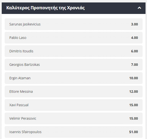 Λογικά ο προπονητής αυτής θα είναι και ο νικητής στη συγκεκριμένη κατηγορία, με τον Σαρούνας Γιασικεβίτσιους της Μπαρτσελόνα να έχει ελαφρύ προβάδισμα σε σχέση με τους συναδέλφους του, αφού προσφέρεται σε απόδοση 3.00. Οι Πάμπλο Λάσο, Δημήτρης Ιτούδης και Μπαρτζώκας συμπληρώνουν την πρώτη τετράδα των πιθανών νικητών, με τον Γιώργο Μπαρτζώκα του Ολυμπιακού, που έχει κάνει εξαιρετική δουλειά στους “ερυθρόλευκους” να δίνεται σε απόδοση 7.00!