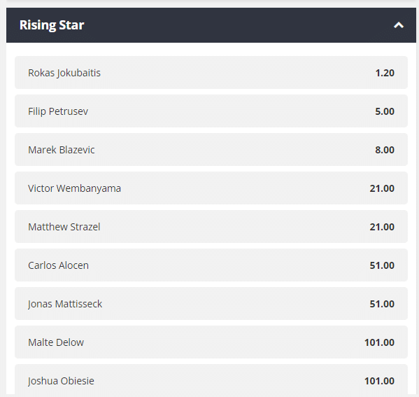 Στην κατηγορία για το ερχόμενο αστέρι της τρέχουσας σεζόν, ο Ρόκας Γιοκουμπάϊτις δείχνει να έχει σαφές προβάδισμα σε σχέση με τους υπόλοιπους παίκτες που βρίσκονται σε σχετική λίστα. Δικαίως θεωρείται ένα από τα ανερχόμενα αστέρια του ευρωπαϊκού μπάσκετ, με τον ομοεθνή προπονητή της Μπαρτσελόνα, Σαρούνας Γιασικεβίτσιους, να τον έχει βάλει ήδη στο οπλοστάσιο της Μπαρτσελόνα! Μόλις στο 1.20 προσφέρεται ο Λιθουανός, με τον Φίλιπ Πετρουσεφ (Εφές) να βρίσκεται δεύτερος στην λίστα, με απόδοση 5.00!