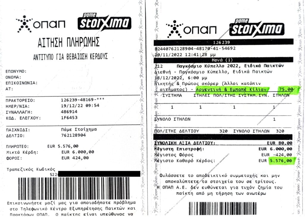 Η αγορά, στον ΟΠΑΠ, πριν την πρώτη σέντρα του τουρνουά πλήρωνε 75.00! Τζόγαρε ένα 80άρι, κάτι που σημαίνει 6.000 ευρώπουλα. Αφαιρέστε το φόρο και θα δείτε πως ο τυπάς, έβαλε στην τσέπη του κάτι περισσότερα από 5,5 χιλιάρικα!