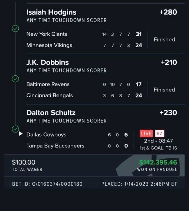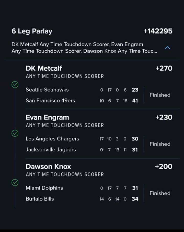 Ανάμεσά τους υπήρχαν το 3.10 του Ντόμπινς στον αγώνα των Μπάλτιμορ Ρέιβενς με τους Σινσινάτι Μπενγκάλς, τα 3.30 των Ένγκραμ (Λος Άντζελες Τσάρτζερς – Τζάκσονβιλ Τζάγκουαρς) και Σουλτζ (Ντάλας Κάουμποϊς – Τάμπα Μπέι Μπουκανίερς) και το 3.70 του Μέτκλαφ στο ματς των Σιάτλ Σίχοκς με τους Σαν Φρανσίσκο 49ers!
