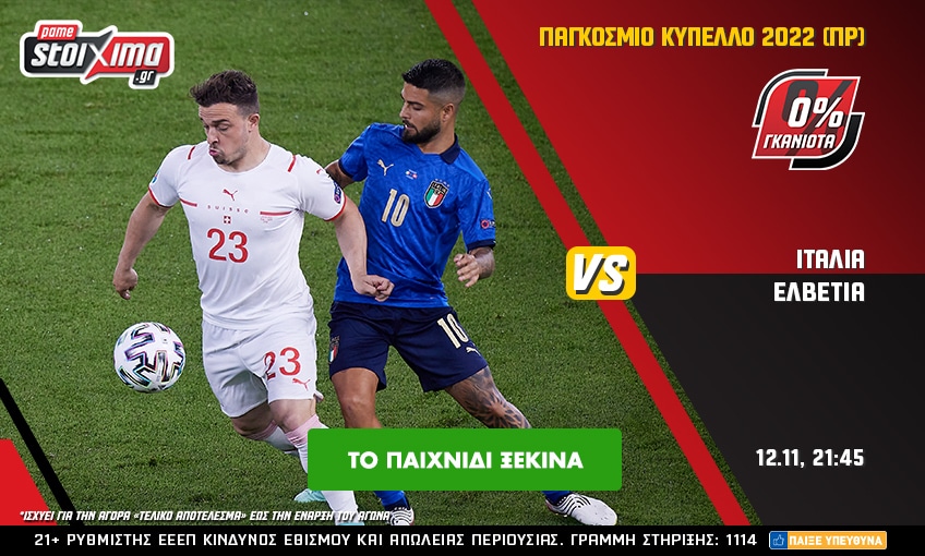 Επίσης, δράση έχουμε και στα προκριματικά του Μουντιάλ 2022. Στο ανανεωμένο Pamestoixima.gr το Ιταλία – Ελβετία το ζεις παραπάνω με 0* γκανιότα** και πολλά ειδικά στοιχήματα για κόρνερ, κάρτες, παίκτες και όχι μόνο.